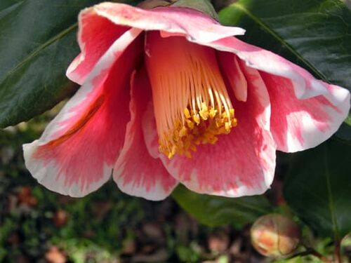 可愛いカメラで何とか撮ってきました。 ピンクに白の縁どりの美しい椿に魅了されました。