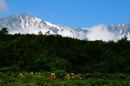 八方山荘小屋あたりから ニッコウキスゲと白馬山麓です。